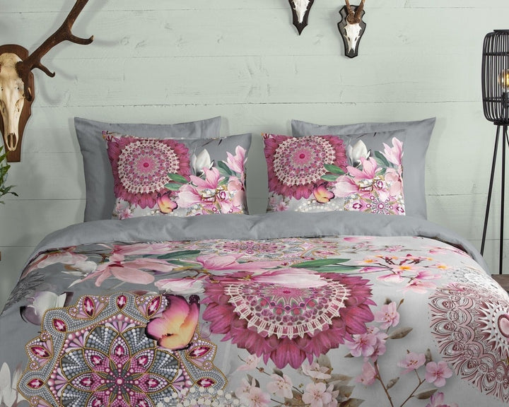 Dit dubbelzijdige dekbedovertrek biedt twee stijlvolle looks: de ene kant is voorzien van gedetailleerde mandala’s, bloemen en planten op een grijze achtergrond, terwijl de andere kant effen grijs is. Zo kun je eenvoudig variëren, afhankelijk van je stemming of interieurstijl.