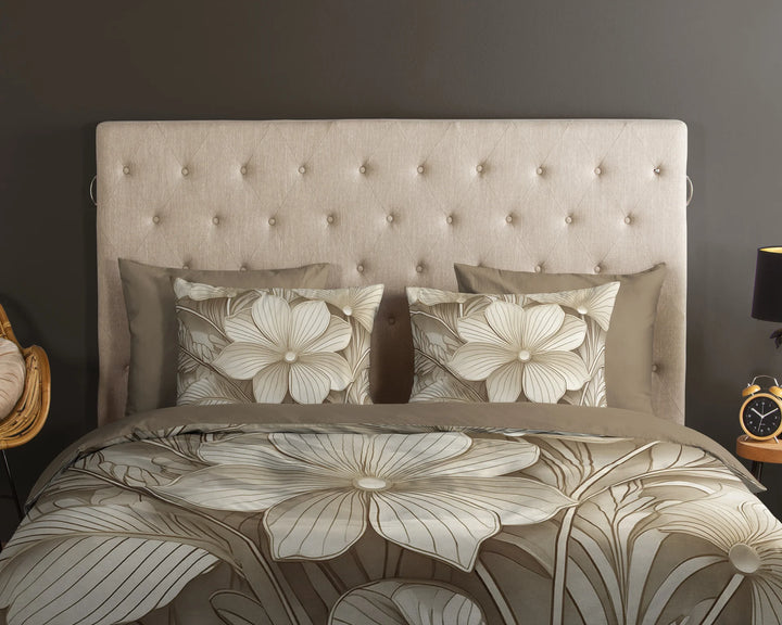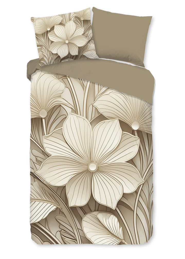 Breng een stijlvolle en serene sfeer in je slaapkamer met het Good Morning dekbedovertrek Artdeco. Het verfijnde bloemenontwerp in warme taupe-, beige- en zandtinten zorgt voor een elegante en rustige uitstraling. De grote, sierlijke bloemen geven het overtrek een luxe en artistiek karakter. De effen bovenkant vormt een mooi contrast en brengt balans in het geheel. Dit dekbedovertrek is de perfecte keuze voor wie houdt van een tijdloze, chique slaapkamerstijl.