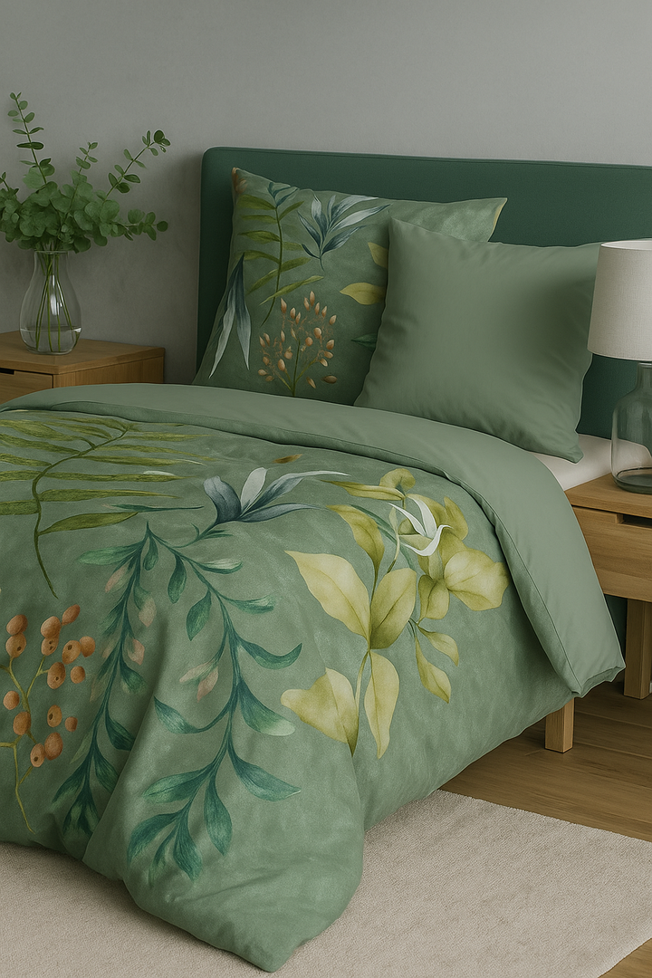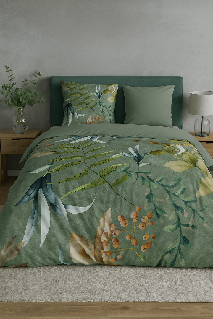 Breng een natuurlijke en rustgevende sfeer in je slaapkamer met het Good Morning dekbedovertrek in groene tinten. Het stijlvolle ontwerp met sierlijke takjes en bladeren in groene en bruinige nuances zorgt voor een warme en harmonieuze uitstraling. De effen groene onderkant brengt rust en evenwicht in het geheel. Dit dekbedovertrek nodigt uit tot ontspanning en een goede nachtrust. Perfect voor wie houdt van een rustige, natuurlijk geïnspireerde slaapkamerstijl.