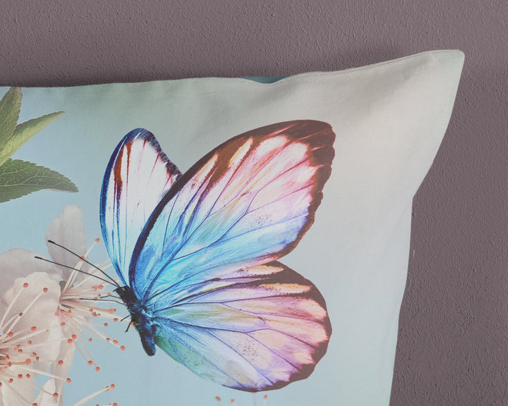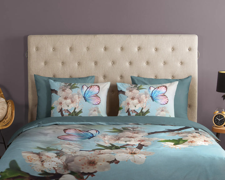 Het Good Morning dekbedovertrek Mayla brengt een vleugje lente in de slaapkamer. De sierlijke print van bloesemtakken met een kleurrijke vlinder zorgt voor een frisse en natuurlijke uitstraling. De lichtblauwe achtergrond geeft het ontwerp een rustige en luchtige sfeer. Dit dekbedovertrek is een echte blikvanger die elegantie en harmonie uitstraalt. Perfect voor wie houdt van een serene en verfijnde slaapkamerstijl.