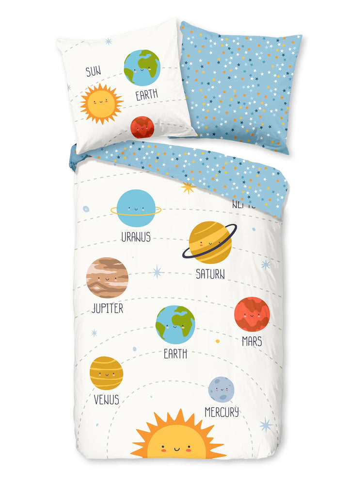 Breng het universum tot leven in de kinderkamer met het Good Morning Astra dekbedovertrek. Dit vrolijke ontwerp neemt jonge ontdekkers mee op een reis langs planeten, sterren en kleurrijke werelden. De combinatie van een witte ondergrond met planeten en een blauwe achterkant vol sterretjes zorgt voor een speelse en frisse uitstraling. Het ontwerp prikkelt de fantasie en maakt naar bed gaan een echt avontuur. Perfect voor kinderen die graag dromen van spannende ruimtereizen.