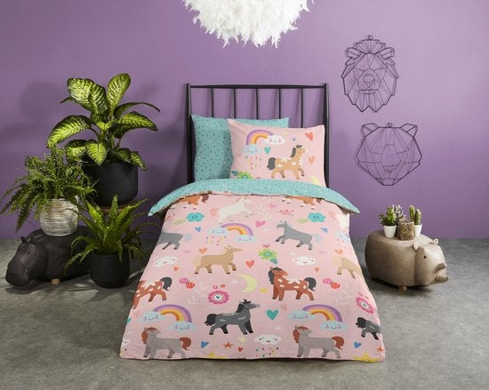 Is jouw kleintje dol op paarden? Dan is het vrolijke Horses dekbedovertrek van Good Morning echt een droom! De print barst van de kleurrijke paarden, omringd door lieve tekeningen zoals hartjes, regenbogen en bloemetjes. De zachte pastelroze achtergrond geeft het overtrek een schattige en dromerige uitstraling. Draai je het om, dan verschijnt er een blauwgroene achterzijde met een ton-sur-ton stippenprint, waarin de witte stipjes speels naar voren komen.