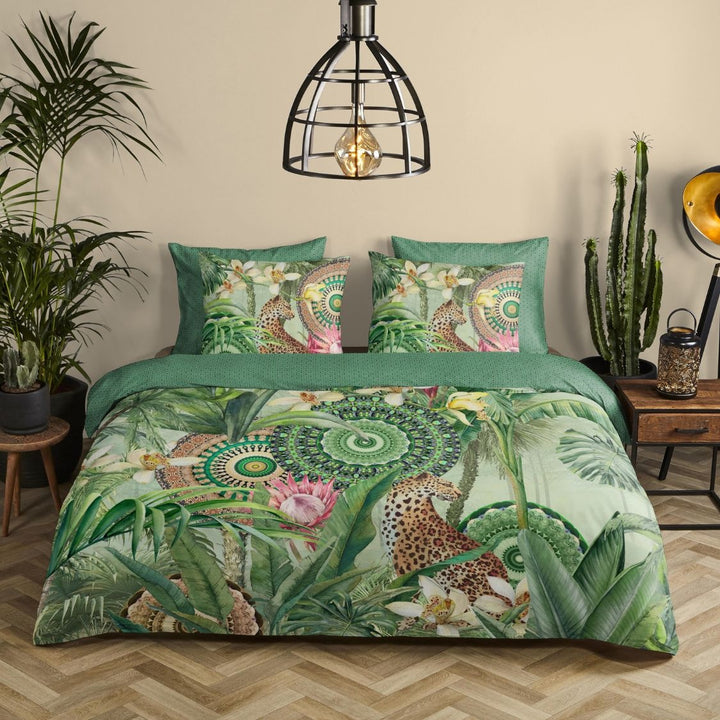 Laat je slaapkamer tot leven komen met het Abhita dekbedovertrek van HiP! Dit opvallende ontwerp combineert frisse groentinten met een weelderig botanisch dessin, vol levendige details zoals palmbomen, gele bloemen, kleurrijke patronen en een krachtige jaguar. De rijke print brengt een avontuurlijke, natuurlijke sfeer in je interieur en zorgt voor een stijlvolle blikvanger op je bed. Extra leuk: de achterzijde van het overtrek heeft een rustiger groen dessin met een verfijnd patroon – perfect voor als je eens wil afwisselen.