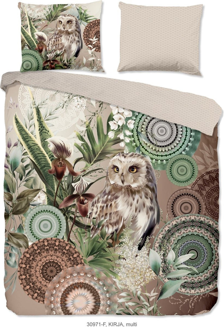 Haal een warme en natuurlijke sfeer in huis met het Kirja dekbedovertrek van HiP! Dit stijlvolle ontwerp toont een indrukwekkende uil te midden van een rijk botanisch landschap vol sierlijke bladeren en mandala’s. De combinatie van diepe groentinten en warme bruinaccenten zorgt voor een moderne, rustgevende uitstraling. De achterzijde is uitgevoerd in een lichtere tint met een verfijnd patroon, wat zorgt voor balans en de mogelijkheid om eenvoudig te variëren in stijl.