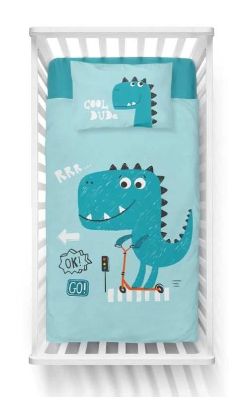Ledikant dekbedovertrek met een dino op een skateboard en de tekst Cool dude