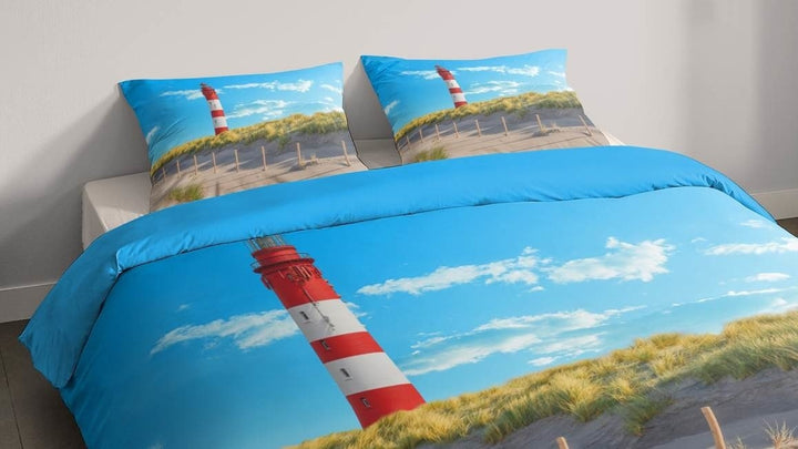 De voorzijde van het strand dekbedovertrek toont de gedetailleerde afbeelding van de vuurtoren, omringd door sierlijke duinen en zand. Het levendige rood en wit van de vuurtoren vormt een prachtig contrast met de rustige blauwe zee en lucht, waardoor het geheel een opvallend en aantrekkelijk ontwerp wordt