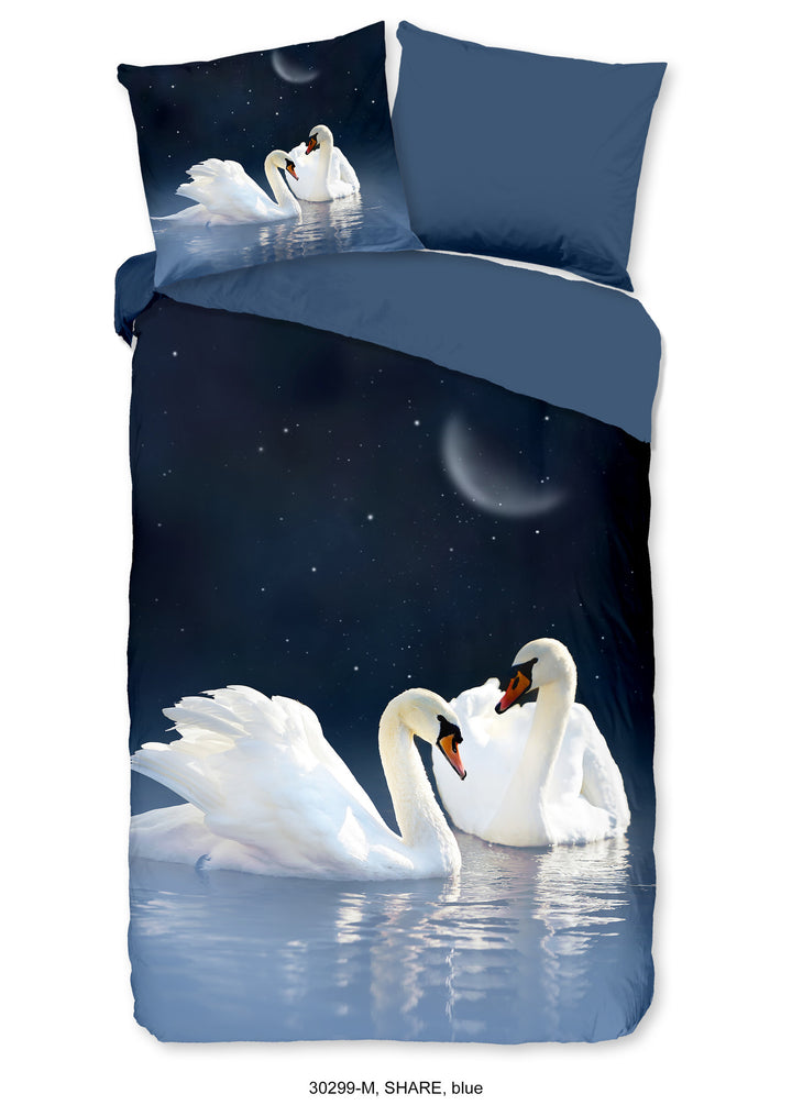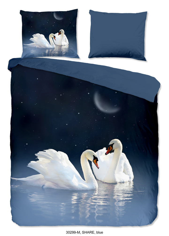 Dit betoverende ontwerp toont twee sierlijke zwanen die samen een prachtig tafereel vormen. Hun houding en uitstraling symboliseren liefde, trouw en gratie – eigenschappen die perfect passen bij een serene en romantische slaapkamerinrichting. De subtiele kleuren en verfijnde details geven het dekbedovertrek een rustige, dromerige sfeer, terwijl het beeld van de zwanen een gevoel van verbondenheid en harmonie oproept. Ideaal voor wie zijn slaapkamer wil omtoveren tot een oase van rust en schoonheid. Een stijlvolle keuze voor iedereen die houdt van een tedere, romantische touch in het interieur.