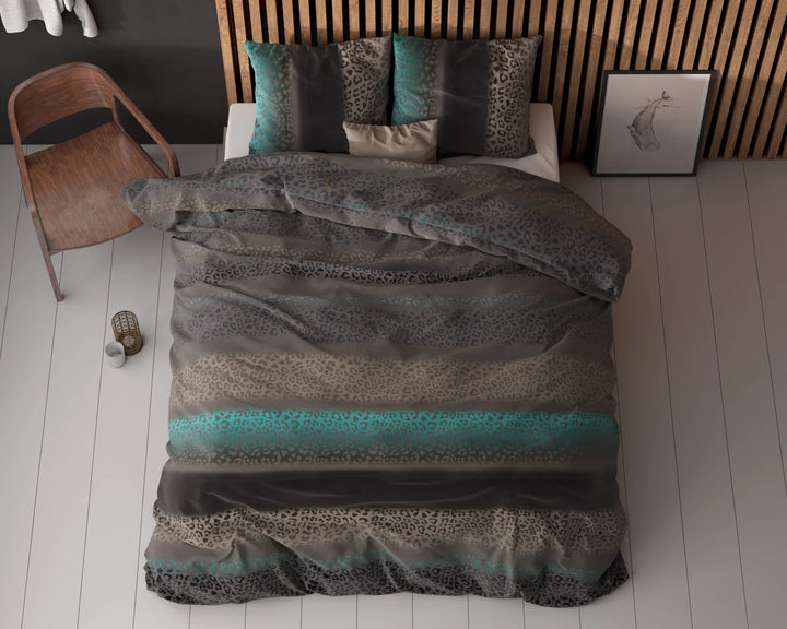 Breng karakter in je slaapkamer met dit gedurfde dekbedovertrek met panterdessin. De mix van grijstinten, zwart en turquoise geeft het ontwerp een eigentijdse en levendige uitstraling. De horizontale banen zorgen voor een spannend en gelaagd effect. De kussenslopen sluiten naadloos aan bij het overtrek en versterken de eenheid. Dit dekbedovertrek is een perfecte keuze voor een moderne inrichting met een stoer accent.